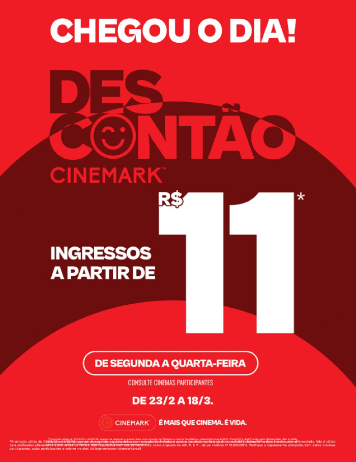 A Semana do Cinema já passou, mas a Cinemark preparou uma surpresa para os cinéfilos conferirem os últimos lançamentos na telona! Do dia 23 de fevereiro a 18 de março o público poderá aproveitar a 4ª edição do Descontão Cinemark, ação exclusiva da empresa que oferece ingressos pelo valor promocional de R$11 nas sessões matinê (início até 16h59) 2D, 3D e XD. Cinemas selecionados da Rede terão também preço promocional de R$13 para as sessões noturnas (a partir de 17h) 2D, 3D e XD, além de R$21 em sessões matinê e R$25 em sessões noturna nas Poltronas DBOX e salas Prime/VIP/Bistrô. A comunicação da campanha é assinada pela agência Magenta. A promoção é válida em unidades selecionadas da Grande São Paulo. Consulte o site oficial para mais informações.