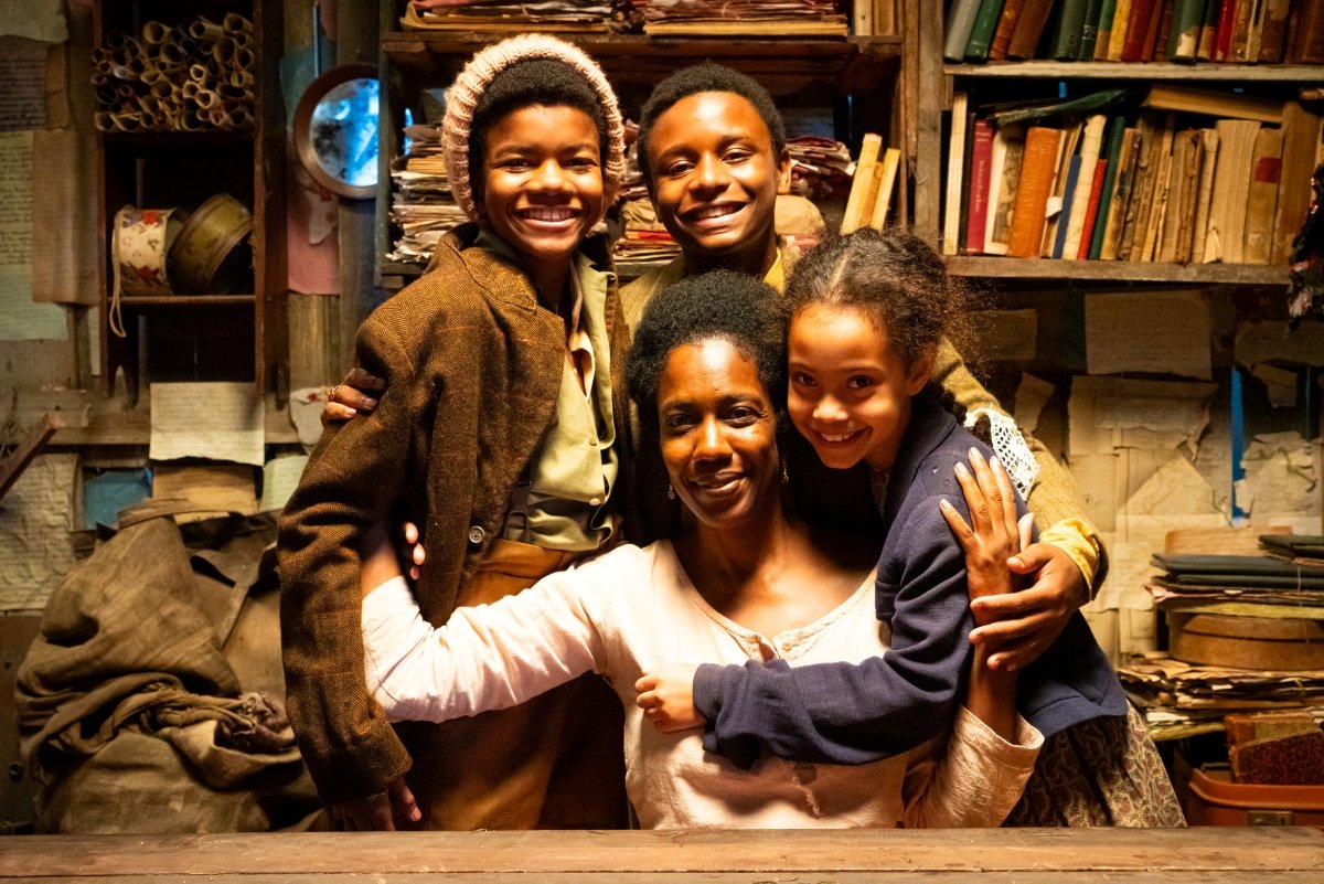 A atriz Maria Gal e os talentos mirins Laura Vick, Raphael Raposo e Thawan Lucas no set de ‘Carolina – Quarto de Despejo’ (Foto: Mariana Vianna)