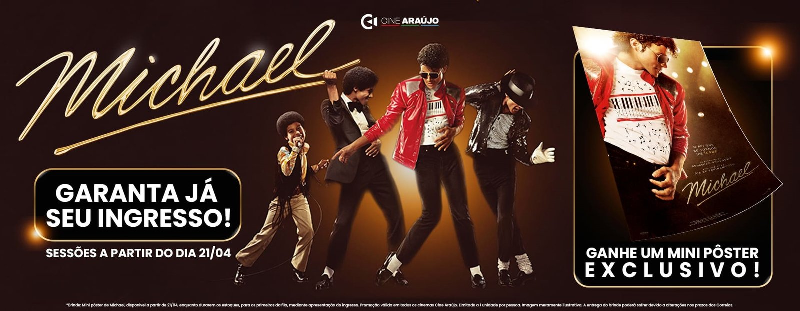 O Cine Araújo já iniciou a pré-venda de ingressos para Michael, cinebiografia que retrata a trajetória de Michael Jackson, com pré-estreia marcada para 21 de abril e estreia oficial em 23 de abril em todas as unidades da rede. Para acompanhar o lançamento, a empresa preparou uma série de ações especiais voltadas à experiência do público, com iniciativas que ampliam a conexão dos espectadores com o universo do artista.