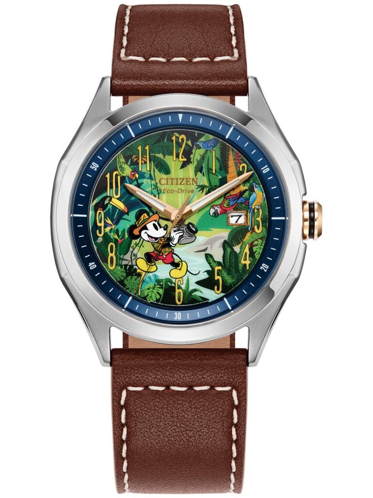 Citizen Disney – Mickey Mouse: Traz uma interpretação elegante e aventureira do personagem, com mostrador verde profundo que exibe folhagens tropicais, aves e Mickey em meio à sua jornada exploradora. A caixa em aço inoxidável prateado de 41 mm confere sofisticação, enquanto a pulseira de couro marrom complementa o visual natural e premium da peça. Equipado com tecnologia Eco-Drive, que funciona com qualquer fonte de luz e dispensa trocas de bateria, o relógio apresenta cristal mineral, marcadores luminosos e resistência à água de 100 m (10 bar). Com estética refinada e narrativa visual encantadora, o modelo está disponível por R$4.290,00.
