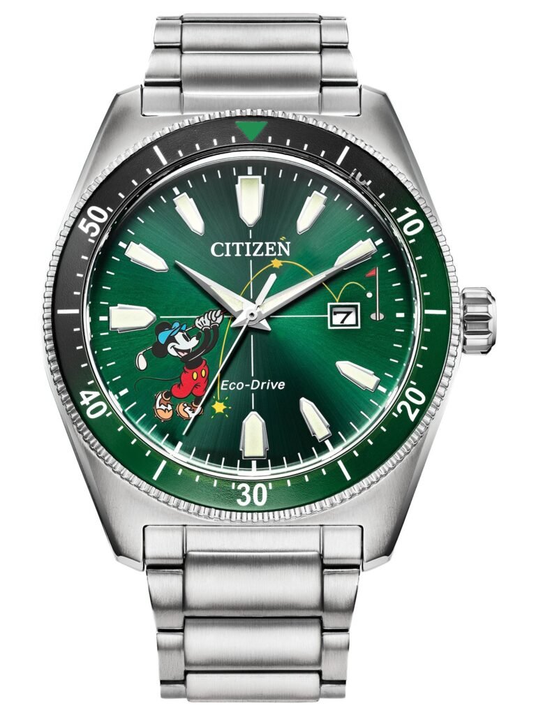 Citizen Disney – Mickey Sport: Apresenta um design inspirado no universo do golfe, com mostrador verde vibrante onde Mickey Mouse surge prestes a fazer uma tacada, criando uma referência divertida e temática. O bezel em preto e verde complementa o visual esportivo, enquanto a caixa em aço inoxidável prateado de 43 mm e a pulseira tipo bracelete em aço conferem robustez, versatilidade e acabamento premium. Equipado com tecnologia Eco-Drive, alimentado por qualquer fonte de luz e dispensando troca de bateria, o modelo traz cristal mineral, marcadores de alta legibilidade e resistência à água de 100 m (10 bar). Esta edição especial está disponível por R$4.290,00.