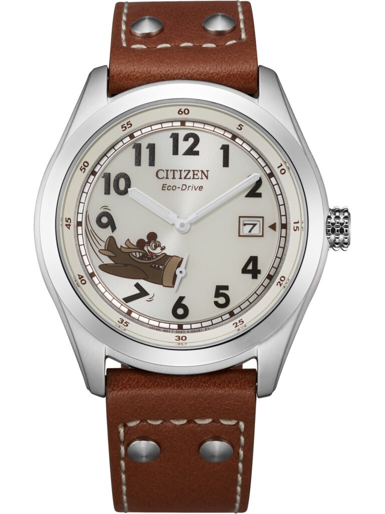 Citizen Disney – Mickey Sport: Combina o charme da aviação vintage com o espírito aventureiro de Mickey Mouse, trazendo um mostrador marfim que exibe o personagem pilotando um avião antigo, cuja hélice funciona como ponteiro de segundos — um detalhe característico e lúdico da coleção. A caixa em aço inoxidável prateado de 40 mm reforça a estética clássica, enquanto a pulseira em couro caramelo com pespontos em marfim e rebites metálicos remete aos cockpits de época, conferindo um visual retrô-premium. Equipado com tecnologia Eco-Drive, alimentado por qualquer fonte de luz e sem necessidade de troca de bateria, o modelo apresenta cristal mineral resistente, arte temática exclusiva e resistência à água de 100 m (10 bar). O relógio está disponível por R$4.290,00.