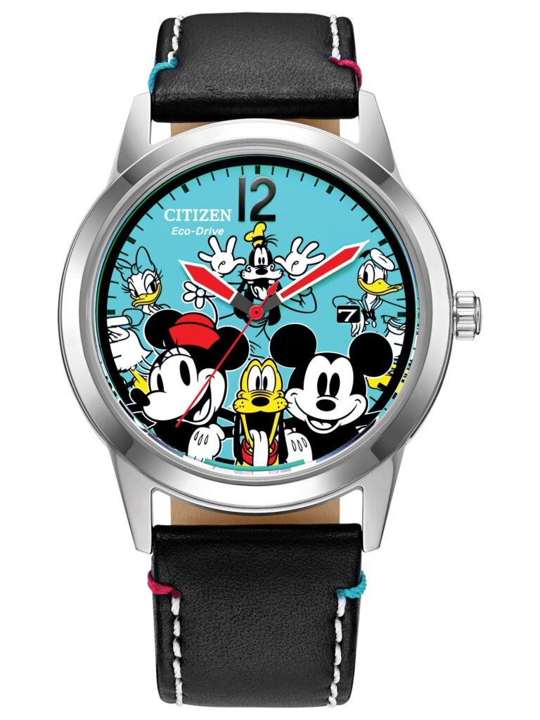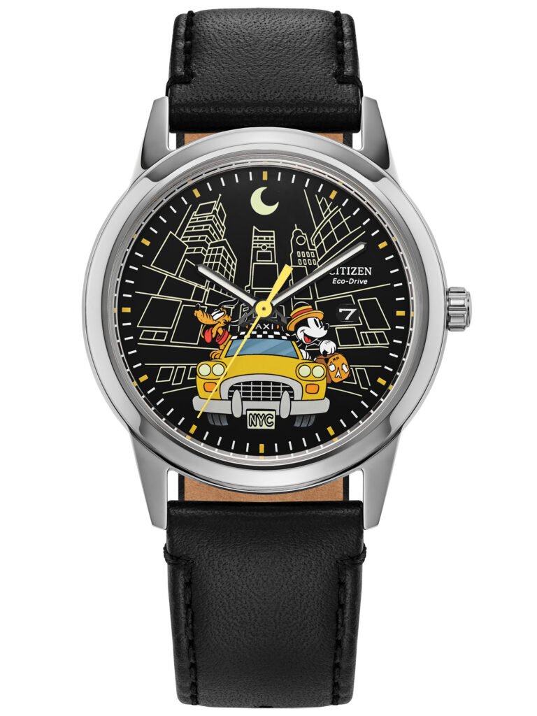 Citizen Disney – Mickey’s Friends: Traz uma narrativa charmosa inspirada na aventura urbana de Mickey Mouse e Pluto explorando Nova Iorque. O mostrador preto apresenta uma ilustração original dos personagens a bordo de um táxi clássico da cidade, enquanto a caixa em aço inoxidável prateado de 40 mm e a pulseira de couro preta criam um visual moderno e elegante. No fundo da caixa, a gravação de uma mala de viagem com o texto “Time to Fly / Since 1928” reforça o caráter colecionável e histórico da peça. Equipado com tecnologia Eco-Drive — alimentado por qualquer fonte de luz e sem necessidade de troca de bateria — o modelo conta ainda com cristal mineral esférico, detalhes luminescentes no mostrador e resistência à água adequada apenas para respingos. O relógio está disponível por R$4.290,00.