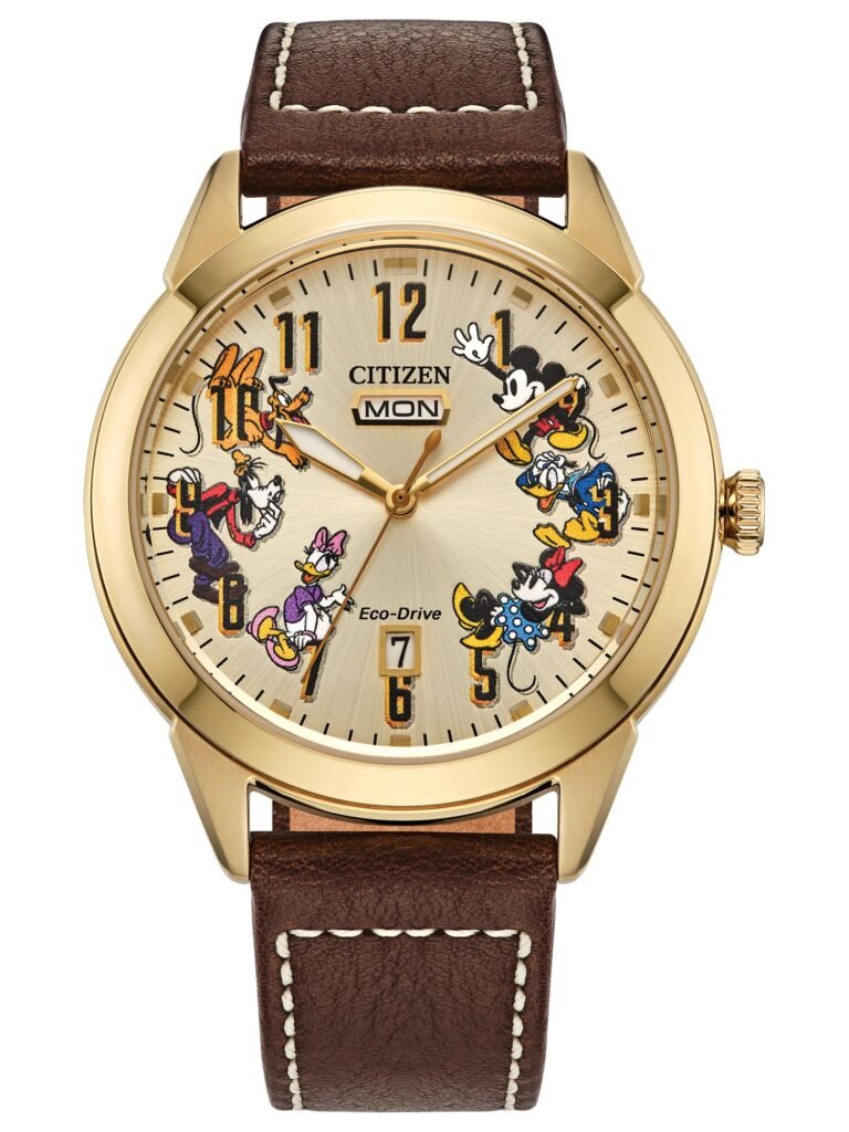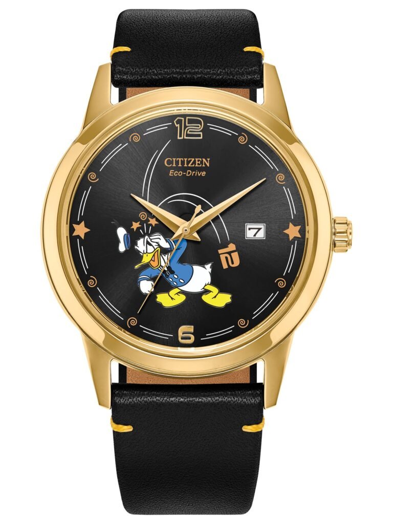 Citizen Disney – Pato Donald: Apresenta um mostrador preto carvão com uma interpretação lúdica do personagem, retratando Donald após uma “queda do marcador” às 12 h, onde o índice dourado aparece deslocado, criando o efeito de “ver estrelas”. A caixa em aço inoxidável com acabamento dourado, de 40 mm, harmoniza-se com a pulseira de couro preta com costura dourada contrastante, resultando em uma estética refinada, divertida e altamente colecionável. Equipado com tecnologia Eco-Drive, alimentado por qualquer fonte de luz e dispensando troca de bateria, o modelo traz cristal mineral, janela de data e resistência à água adequada a respingos. O relógio está disponível por R$4.290,00.
