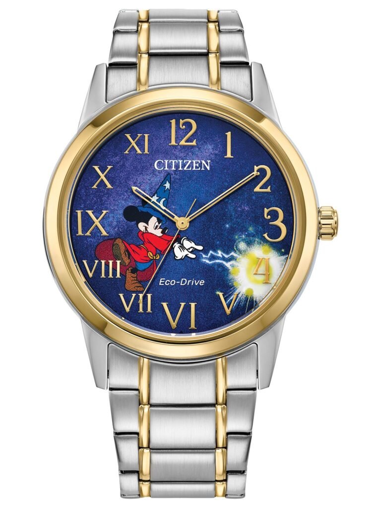 Citizen Disney – Mickey Mouse: Celebra o icônico momento em que Mickey aparece como aprendiz de feiticeiro, trazendo um mostrador azul profundo no qual os numerais árabes se transformam em romanos em uma transição visual mágica que reforça o tema da animação clássica. A caixa de 40 mm e a pulseira em aço inoxidável dois-tons (prateado + dourado) conferem elegância atemporal e apelo de colecionador, equilibrando estética refinada com narrativa afetiva da Disney. Equipado com tecnologia Eco-Drive, alimentado por qualquer fonte de luz e dispensando troca de bateria, o modelo conta também com cristal mineral e resistência à água adequada apenas a respingos. O relógio está disponível por R$3.990,00.