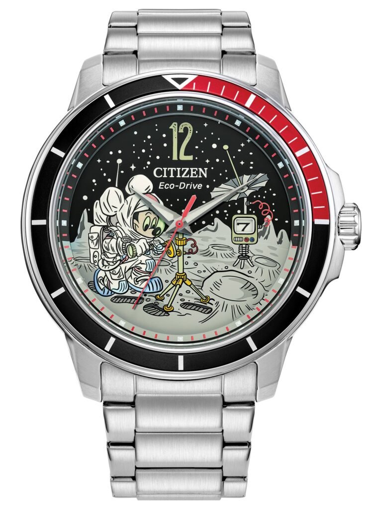 Citizen Disney – Mickey Mouse: É inspirado na aventura espacial do personagem e traz um mostrador preto com detalhes luminosos e elementos temáticos que evocam o universo lunar, criando uma estética divertida sem abrir mão da sofisticação. O bezel em preto e vermelho se destaca sobre a caixa em aço inoxidável prateado de 42 mm, enquanto a pulseira também em aço reforça o visual técnico e premium da peça. Equipado com tecnologia Eco-Drive, que funciona com qualquer fonte de luz e dispensa troca de bateria, o modelo possui cristal mineral, janela de data e resistência à água de 100 m (10 bar). O relógio está disponível por R$4.290,00.
