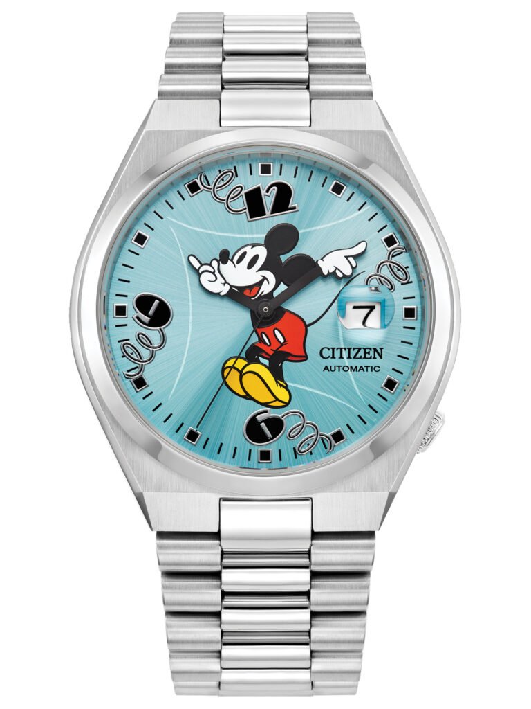 Citizen Disney – Tsuyosa Mickey Mouse: Combina a estética moderna da linha Tsuyosa com o charme clássico de Mickey Mouse, trazendo um mostrador azul-celeste sunray que transmite leveza e dinamismo. No centro, Mickey aparece em pose de salto, acompanhado por três numerais inclinados que sugerem movimento contínuo, adicionando um toque temático sutil e sofisticado. A caixa em aço inoxidável prateado de 40 mm harmoniza-se com a pulseira integrada em aço, que alterna acabamentos escovado e polido, reforçando o design premium da peça. O fundo de caixa aberto revela o movimento automático calibre 8210 — com reserva de marcha de aproximadamente 42 horas e função hack (parada de segundos) — destacando o apelo mecânico do modelo. Com cristal de safira, janela de data às 3 h e resistência à água de 50 m (5 bar), o relógio está disponível por R$4.290,00.