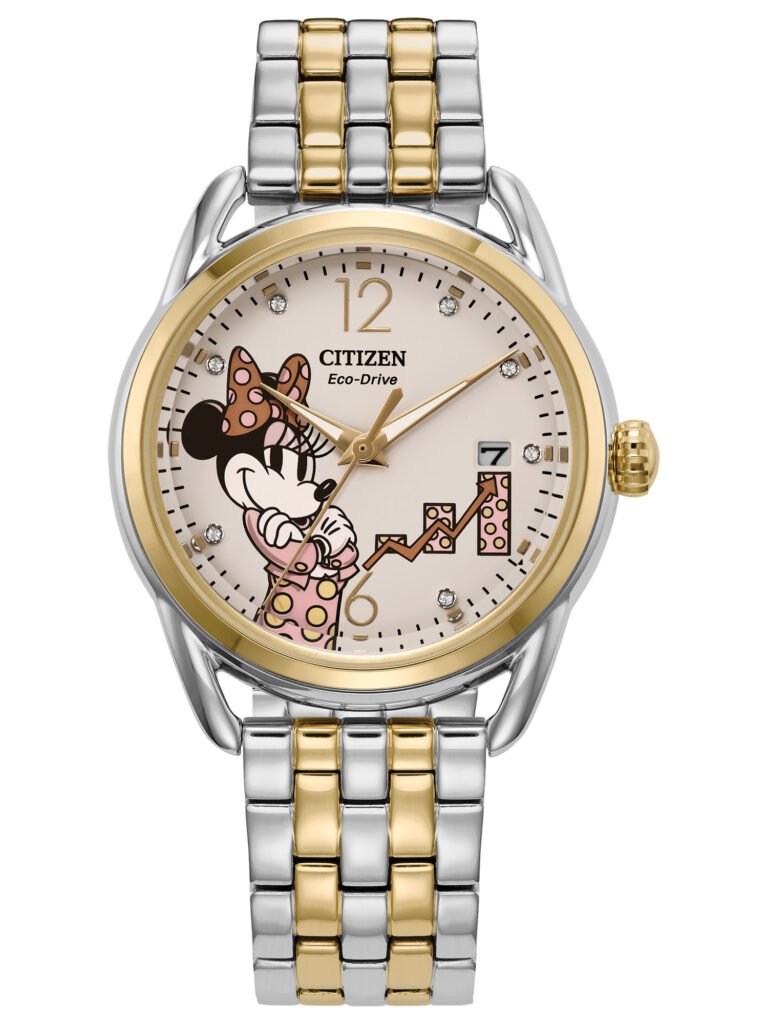 Citizen Disney – Minnie Mouse: Celebra o empoderamento feminino com um mostrador creme que apresenta arte original da Disney, assinada por Jeff Shelly, onde Minnie exibe um gráfico ascendente simbolizando crescimento, conquista e autoconfiança. Os marcadores em cristais cintilantes remetem à clássica estampa polka dot do traje da personagem, adicionando delicadeza e brilho ao design. A caixa de 36 mm em aço inoxidável dois-tons (prateado e dourado) combina com a pulseira igualmente bicolor, criando uma estética elegante e versátil, ideal tanto para o uso cotidiano quanto para ocasiões especiais. Equipado com tecnologia Eco-Drive, alimentado por qualquer fonte de luz e sem necessidade de troca de bateria, o modelo conta com cristal mineral e resistência à água de 100 m (10 bar). O relógio está disponível por R$3.490,00.