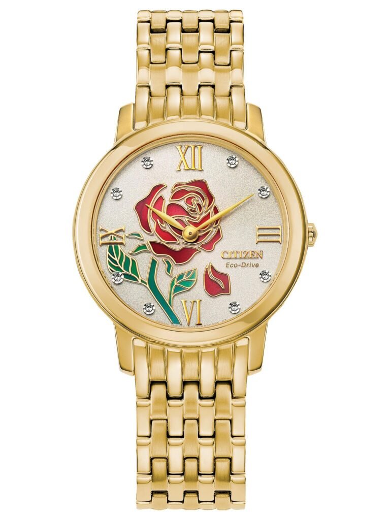 Citizen Disney – Belle: Presta homenagem à icônica princesa de A Bela e a Fera com um mostrador champanhe adornado pelo símbolo da rosa e oito marcadores de diamante que elevam o modelo ao universo da joalheria fina. A caixa de 30 mm e a pulseira em aço inoxidável com acabamento dourado reforçam a estética sofisticada e atemporal da peça, ideal para quem busca elegância com narrativa temática. Equipado com tecnologia Eco-Drive, que funciona com qualquer fonte de luz e não exige troca de bateria, o modelo traz cristal de safira e resistência à água de 50 m (5 bar). O relógio está disponível por R$4.490,00.