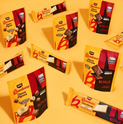 O match entre lovebrands acontece de forma estratégica e cria o cenário perfeito para os devoradores: consumir séries e snacks ao mesmo tempo, resultando em uma experiência completa nos momentos de maratona. A Bauducco® incorpora as cores preto e vermelho, da marca da Netflix, nas embalagens dos lançamentos, além do icônico símbolo de “próximo episódio”, refletindo também na comunicação, com o degradê das cores ao fundo, e na mistura de fontes do universo de ambas em KV e peças.