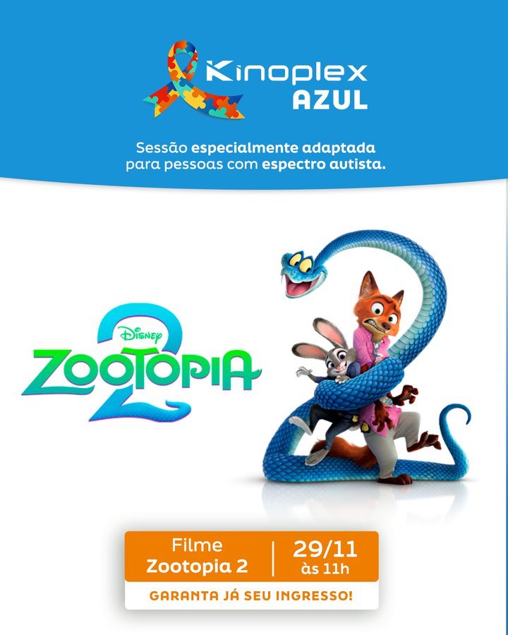 No sábado (29), às 11h, o Kinoplex realizará mais uma sessão adaptada, o Kinoplex Azul, um projeto dedicado a oferecer uma experiência cinematográfica inclusiva para crianças, jovens e suas famílias no espectro autista. O filme em exibição será Zootopia 2, o novo filme de animação da Walt Disney Animation Studios.