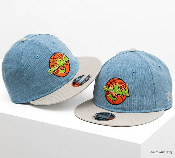 O headwear ocupa papel central na coleção, com o clássico snapback 9FIFTY em versões A-Frame (com painel frontal levemente elevado) e Retro Crown (desestruturado com estética vintage), que trazem aplicações do logo Space Jam e referências às equipes e personagens do universo do filme.