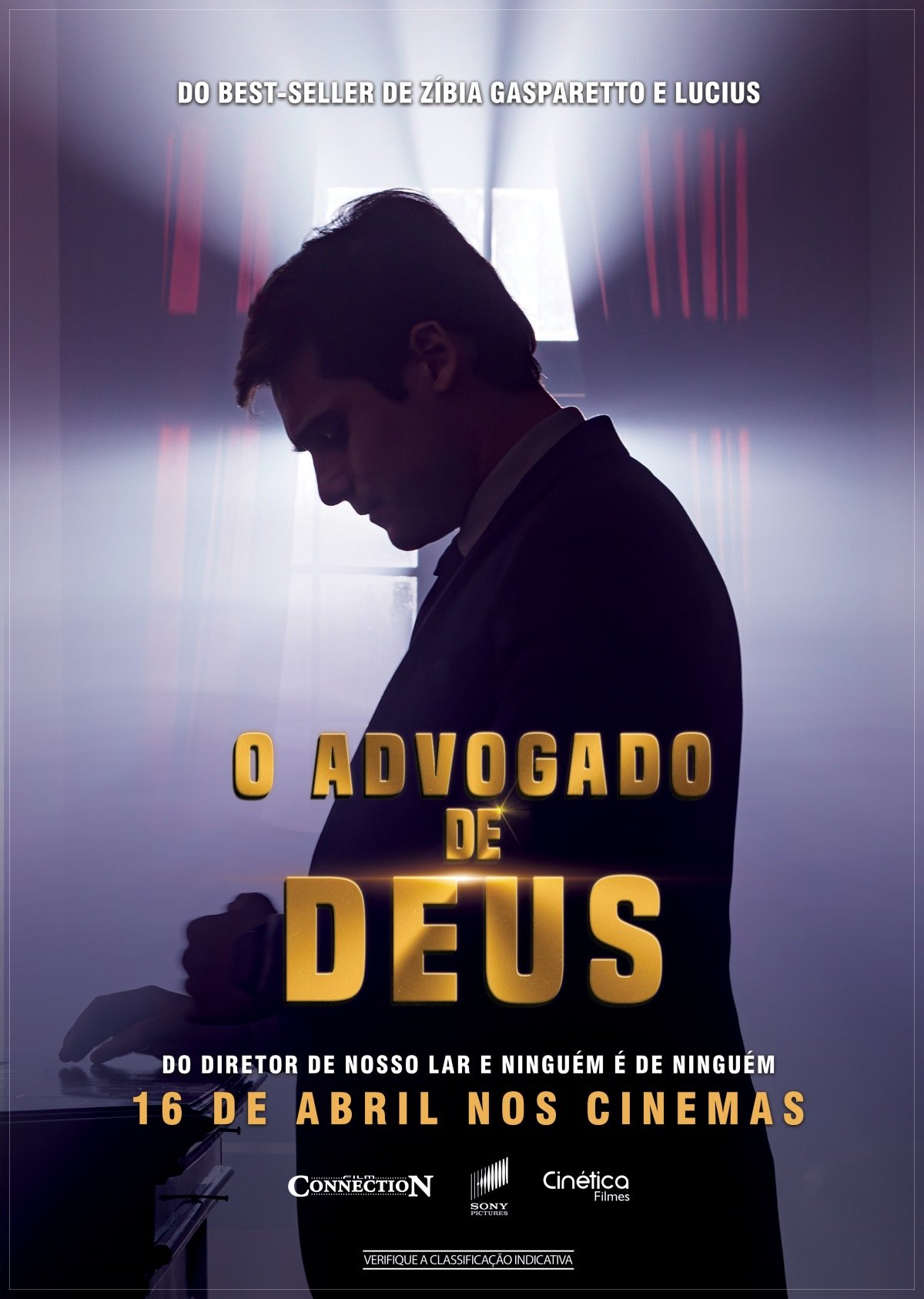 O Advogado de Deus, novo filme do diretor Wagner de Assis, estreia nos cinemas no dia 16 de abril. A data foi anunciada com a divulgação de um vídeo que traz a pergunta “você acredita em justiça divina?” nas redes sociais. Adaptado do best-seller da médium Zibia Gasparetto, lançado em 1998, o filme tem no elenco Nicolas Prattes, Lorena Comparato e Danilo Mesquita vivendo uma história de amor e suspense, que envolve crimes do passado e do presente, além de colocar à prova a justiça dos homens. Uma produção da Cinética Filmes, com distribuição da Sony Pictures.