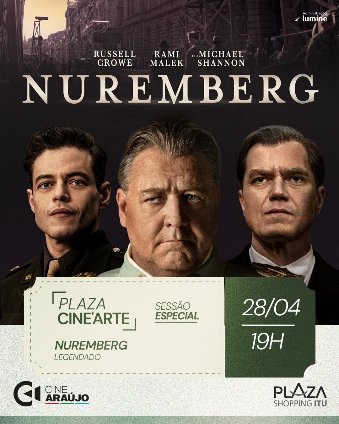 O Plaza Shopping Itu segue com a programação do Plaza Cine’Arte, iniciativa que consolidou uma nova opção de lazer cultural na cidade ao trazer produções premiadas. Em parceria com o Cine Araújo, o shopping terá a exibição do drama histórico “Nuremberg” na próxima terça-feira, dia 28 de abril, às 19h. O longa será apresentado em versão legendada, mantendo a missão do projeto de valorizar o cinema de arte e as narrativas consagradas pela crítica especializada.